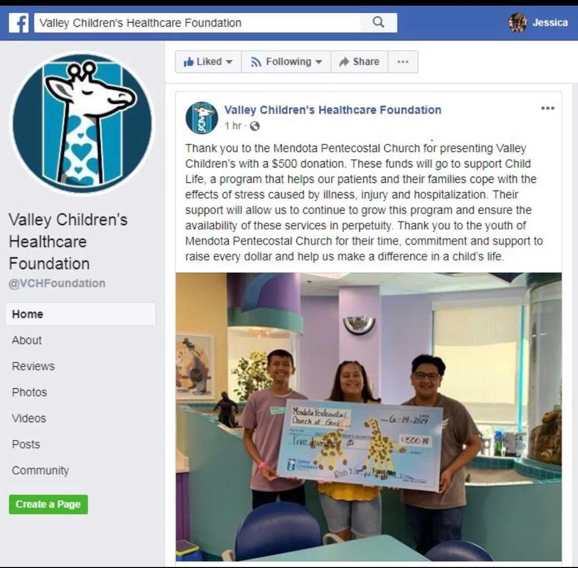 So far the Valley Children’s Hospital Ministry has been able to make two donations. We would like to thank the youth of Mendota P.C.G for raising money for Valley Children’s hospital!